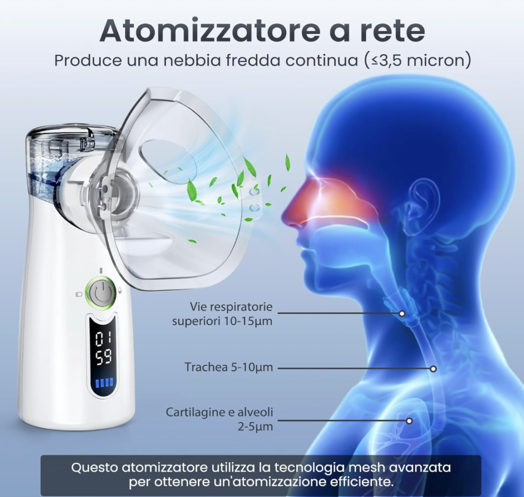 La Tecnologia Mesh con vibrazioni ad alta frequenza di 120 KHz ± 10% penetra rapidamente assorbendo istantaneamente il farmaco evitando sprechi. Facilmente trasportabile ed adattabile ad ogni esigenza senza rinunciare ai tuoi impegni quotidiani